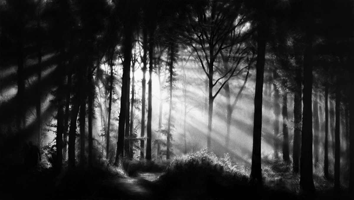 Forests have long been understood as symbolic spaces: places of initiation, introspection, and transformation. In myth and literature, they are sites where certainty dissolves, where familiar paths disappear, and where one must proceed without clear orientation. To enter the forest is to enter the unknown. In Fairmount Forest (2014), Forest of Doxa (2014), and In the Garden, Et in Arcadia Ego (2014), Longo transforms the forest into an inner landscape. Executed in stark black and white, these works envelop the viewer in dense shadow, offering no horizon, no panoramic release. The experience is immersive, even confronting - but never empty. Light filters through the trees in fragments, breaking through the canopy with a restrained, almost sacred presence. It does not conquer the darkness; it coexists with it. This echoes not only Western solstice traditions, but also Eastern philosophies, where darkness and light are understood as interdependent forces rather than opposites. In the ancient Chinese Taoist thought, for example, yin and yang continually give rise to one another: stillness generating movement, darkness allowing light to emerge. |