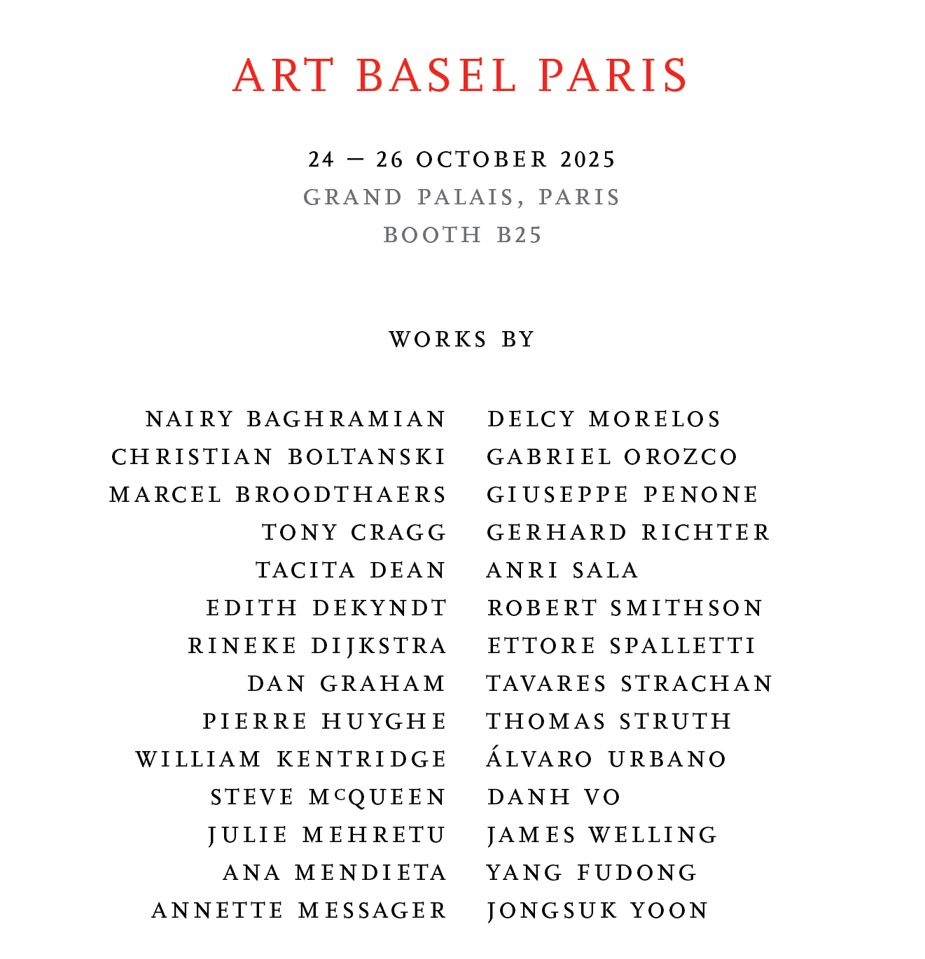 Images: Anri Sala, No Window No Cry, (Olavo Redig de Campos), 2016. Music box, glass, wooden window frame.96 5/8 x 63 3/4 x 2 1/8 in. (245.5 x 162 x 5.5 cm); Nairy Baghramian, nameless, 2025 (detail). Neon tubes, glass, aluminum, silicone. 59 x 92 1/2 x 13 3/4 in. (150 x 235 x 35 cm); Marcel Broodthaers, Deux Tonneaux, 1966. Wooden barrels, paint, eggshells and mussel shells. 13 x 9 7/8 x 9 7/8 in. (33 x 25 x 25 cm); Tacita Dean, Sakura (Abe), 2024. Colored pencil on Fuji Velvet paper mounted on paper. 107 3/4 x 136 3/8 in. (273.6 x 346.5 cm); Gabriel Orozco, Zugaikotsu, 2020. Tempera and gold leaf on linen canvas. 47 1/4 x 47 1/4 x 1 1/4 in. (120 x 120 x 3.2 cm); Tavares Strachan, Gemini XI (Mino Weapons), 2025. Pigment, acrylic paint, pulp on panel. 36 x 36 x 1 in. (91.4 x 91.4 x 2.5 cm); Paul Sietsema, Arrangement, 2025. Enamel on linen. 48 × 48 × 1 1/8 in. (121.9 × 121.9 × 2.9 cm). Photo: Lee Thompson/Flying Studio; Annette Messager,Ensemble CB-AM, 2022. 18 shoes. 39 3/8 x 37 3/8 x 13 3/4 in. (100 x 95 x 35 cm) (overall); Left: Portrait of Andrea Fraser; Rendering of the Fondation Cartier at place du Palais-Royal, Paris. Photo: Jean Nouvel/ADAGP.;© Palais de Tokyo. Photo: Florent Michel; Dan Graham, Tight Squeeze, 2015. La Folie, Clos Vougeot, Burgundy, France. As part of TERRA, An exhibition across Cultural Heritage Sites in Burgundy. Photo: James Retief; Maurizio Cattelan, Comedian, 2019. Banana and adhesive tape. Dimensions variable. Photo: Zeno Zotti. Courtesy, Maurizio Cattelan’s Archive |