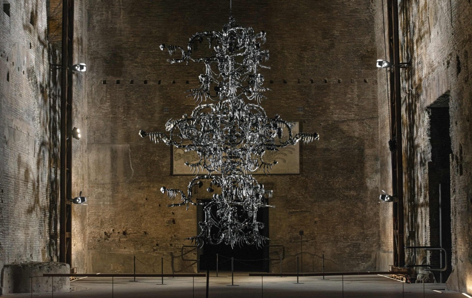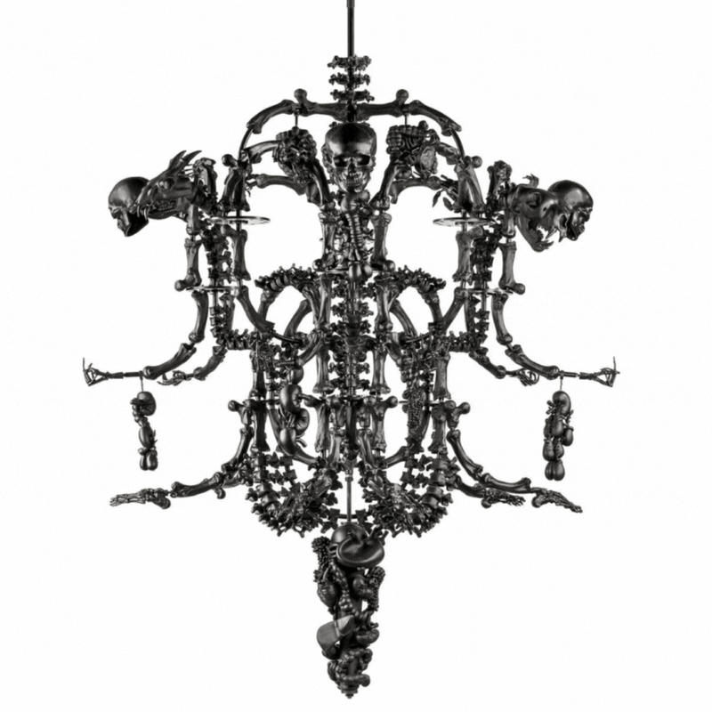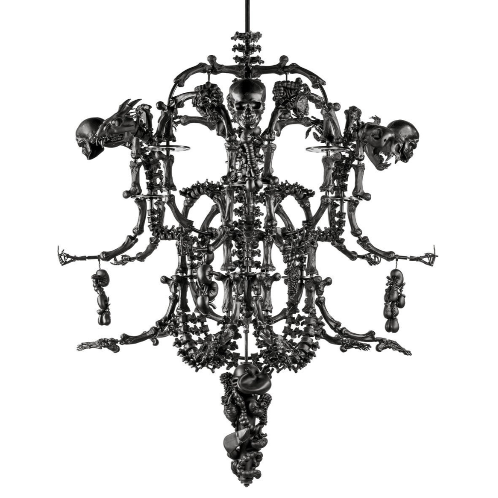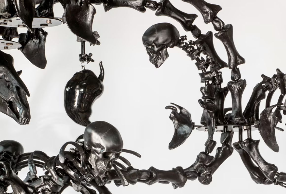 To understand Obsidian (2021) is to trace its lineage to Ai Weiwei’s monumental installation La Commedia Umana (2017–2021). Suspended within the Terme di Diocleziano in Rome (2022) and later the Abbey of San Giorgio Maggiore in Venice (2022), this vast black Murano-glass chandelier - over 2,000 hand-crafted bones, skulls, organs, and surveillance cameras - hung like a spectral relic between past and present. It confronted visitors with an unsettling truth: death, decay, and darkness are woven into the very fabric of the human story.