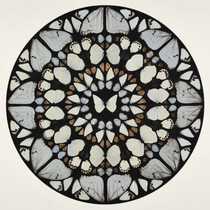 In his Psalms series (2008–2015), Hirst appropriates the radial symmetry of Gothic rose windows, replacing stained glass with a kaleidoscope of butterfly wings and shimmering diamond dust. The effect is both devotional and decorative, evoking the divine order once conveyed through geometry and light. Yet these works glitter with a synthetic glamour, like spiritual simulacra for the Instagram age. Is this still sacred art? Or is it the memory of the sacred made material, collectible, and quietly haunting?